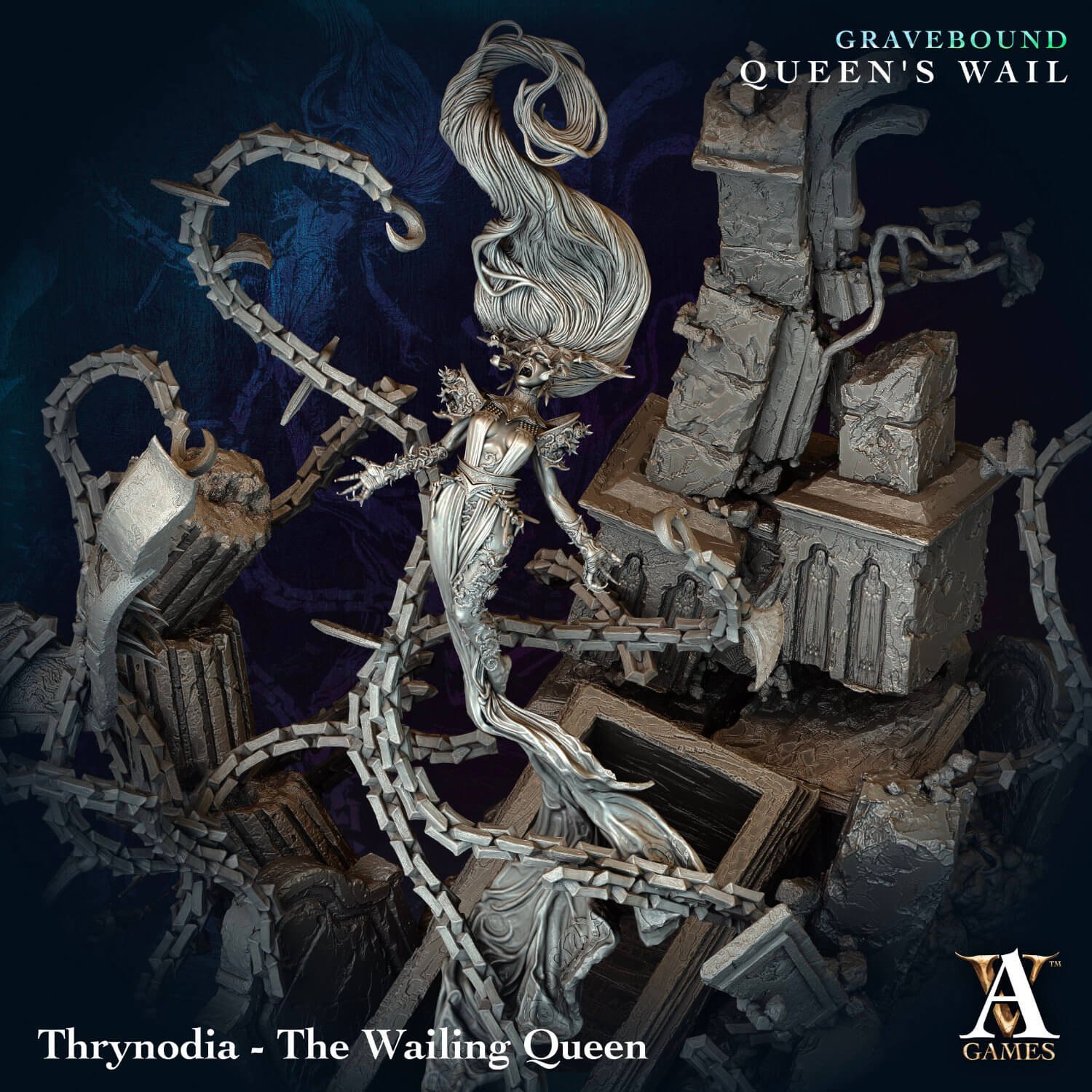 Gravebound - Queen's Wail includes 27 new high-quality STL models and bases! Including 3 new Archvillain Society models and the new monthly Archvillain Bestiary!